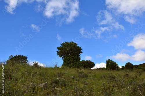 © Iker, Obraz premium Meadow view with adult juniper tree, holm oak and cloudy blue sky.