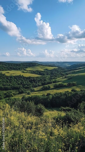 © Esteh, Fototapeta premium Meadow vista rolling hills under cloudy skies
