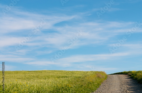 Fototapeta premium Meadow wheat field and cloudy sky