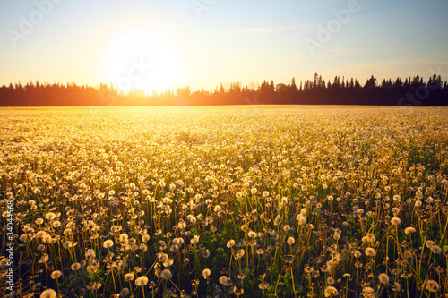 © Dudarev Mikhail, Obraz premium Meadow with blooming dandelions on sunset sky background