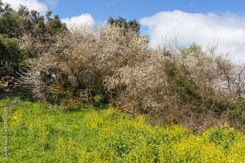 Obraz premium Meadow with blooming flowers and trees against the sky