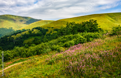 Fototapeta premium meadow with purple flowers in Carpathian mountains in summer