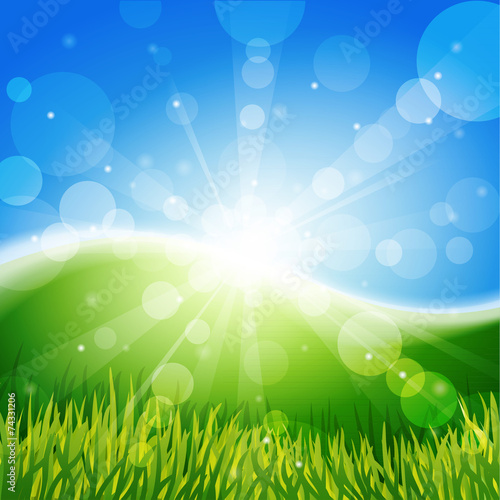 © pokki, Obraz premium Meadow with sun and blue sky.