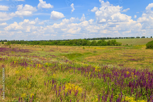 © olyasolodenko, Fototapeta premium Meadow with wild purple salvia flowers. Summer landscape