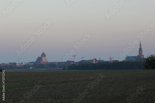 Fototapeta premium Meadows with misty view on the city of Greifswald, Mecklenburg-Vorpommern,...