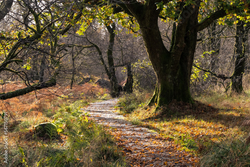 © Thomas, Naklejka premium Meandering path through forest in golden winter light, Scotland