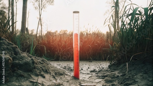 Fototapeta premium Measuring device in a field with grass and crops, indicating environmental conditions.
