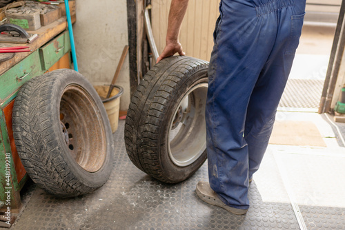 © ARVD73, Fototapeta premium Mechanic changing tire in car service. Tire rotation machine.Car mechanic mounts tire on wheel in a workshop.