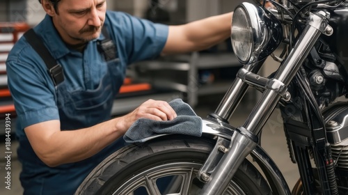 © 69, Obraz premium Mechanic Cleaning Chrome Parts on a Motorcycle in Modern Workshop Environment