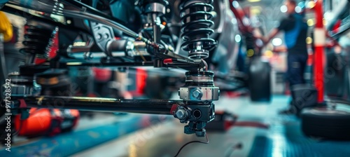 © spyrakot, Fototapeta premium Mechanic Fine-Tuning Race Car Suspension in High Tech Garage with Tools and Diagnostic Equipment