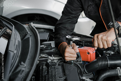 © Nonthanat, Fototapeta premium Mechanic fixing a car at home. Repair and service.