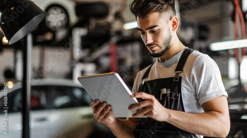 Fototapeta premium Mechanic in a car repair shop using a digital tablet for diagnostics, illustrating the integration of technology in automotive maintenance and repair