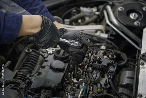 © Dong, Obraz premium Mechanic in black gloves repairs engine with ratchet
