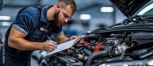 © Dusit, Obraz premium mechanic inspecting car engine while taking notes, focused and diligent.