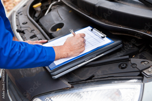 © Andrey Popov, Naklejka premium Mechanic Maintaining Car Records