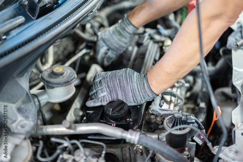 © Jitti, Obraz premium Mechanic's hands are inspecting the engine.