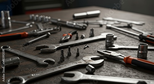 © Seree , Fototapeta premium Mechanic's Tool Set on Workbench - Close-up of various hand tools neatly arranged on a dark gray workbench, ideal for mechanics, DIY projects, and repair work