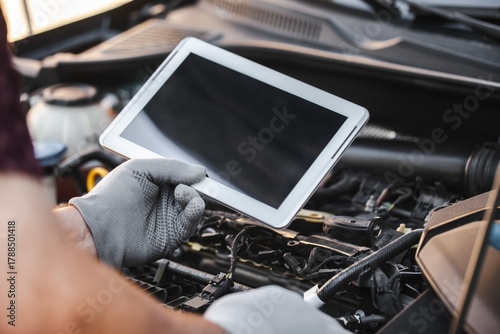 Naklejka premium Mechanic uses a digital table to record error engine checks