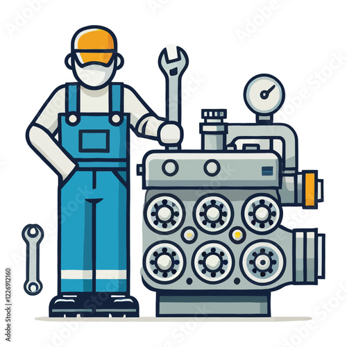 © Ngilustrasi, Fototapeta premium Mechanic with Engine Repair Tools Illustration