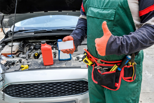 © RomanR, Fototapeta premium Mechanic with visit card posing near car with open hood
