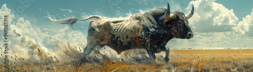 Obraz premium Mechanical bull with kinetic energy converters charging through the energy fields of a power plant pasture
