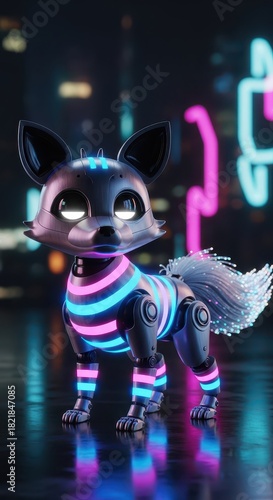 Obraz premium Mechanical canine companion exhibits bright neon striping in a dark urban...