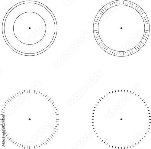 Naklejka premium Mechanical clock faces with arabic numerals, bezel. Timer or stopwatch element. Mechanical clock face dials template set. Classic clocks and watches with arabic and roman numerals for your own design