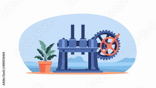 © janda, Obraz premium Mechanical device with cogwheel and potted plant in landscape