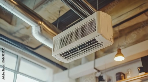 Obraz premium Mechanical Elegance Industrial Architecture: Air Conditioner and Metal Pipes.Close-up of Industrial Air Conditioning System in Modern Office.Concept of industrial design, modern office interior, HVAC