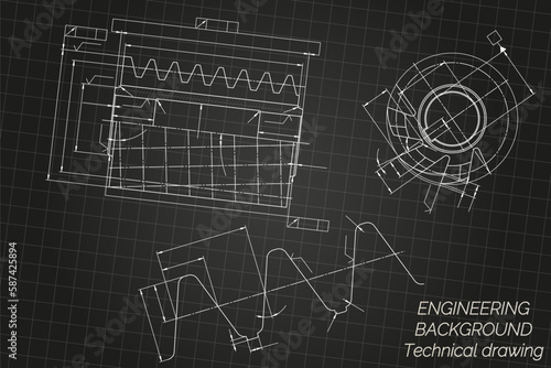 Fototapeta premium Mechanical engineering drawings on light background. Cutting tools, milling cutter. Technical Design. Cover. Blueprint. Vector illustration.