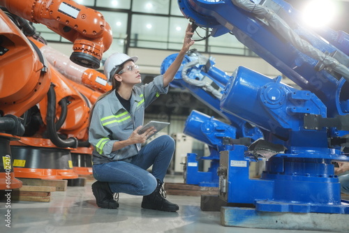Fototapeta premium Mechanical engineers with robotic welder., Programming development technology work. Female industrial engineer working at automated AI robotic production factory