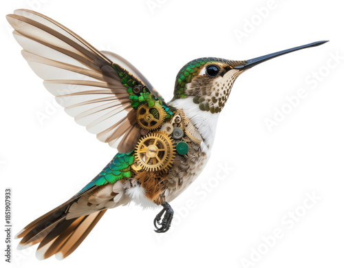 Obraz premium Mechanical hummingbird flight with robotic wings futuristic avian motion technology inspiration engineering illustration isolated on white background