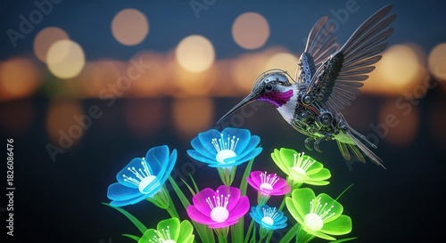 Fototapeta premium Mechanical hummingbird hovering among vibrant, bioluminescent flora at...