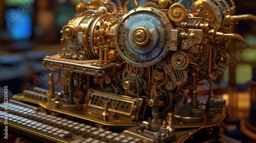 Fototapeta premium Mechanical Majesty: Unveiling the Intricate Steampunk Computer Macro. Generative AI
