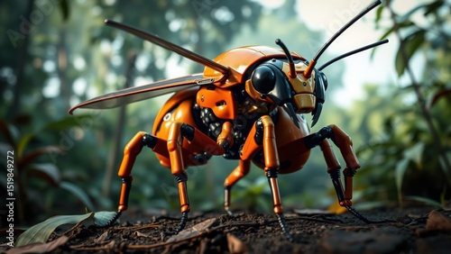 © IsabellaNoviDwita, Fototapeta premium Mechanical marvel: Close-up of a detailed steampunk wasp in a natural setting
