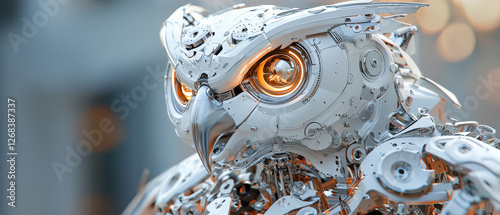 Fototapeta premium Mechanical Owl Robot: Glowing Eyes, Intricate Detail