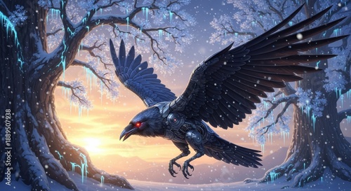 Naklejka premium Mechanical raven soars through a fantasy winter forest during twilight