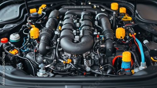 © Nitchalee N., Fototapeta premium Mechanics repair and engine restoration, A detailed view of a high-performance engine showcasing intricate components and vibrant yellow accents.