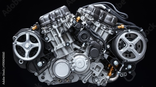 © Kunalai, Naklejka premium Mechanics repair to improve engine efficiency. Engine close-up showcasing intricate mechanical components on a dark background.