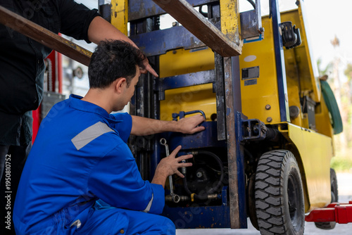 © Wasana, Fototapeta premium Mechanics repairing forklift engine in vehicle workshop