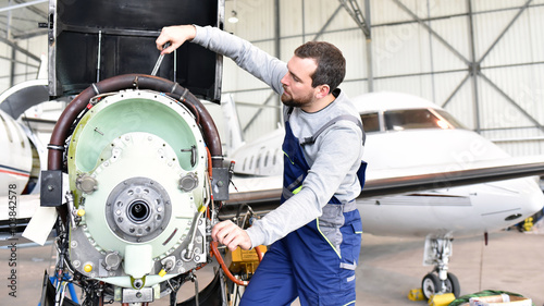 © industrieblick, Naklejka premium Mechanik samolotu naprawia silnik samolotu w hangarze