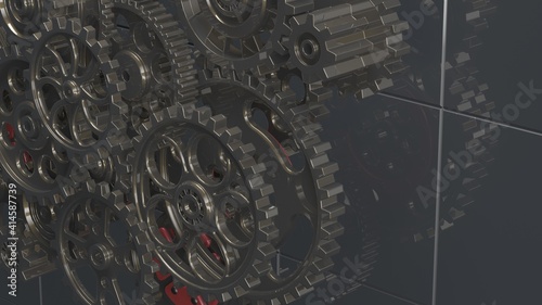 Fototapeta premium Mechanism black-red gears and cogs at work on spot light background....