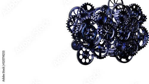 Obraz premium Mechanism blue metallic gears and cogs at work under white spot lighting background. Industrial machinery. 3D illustration. 3D high quality rendering. 3D CG.