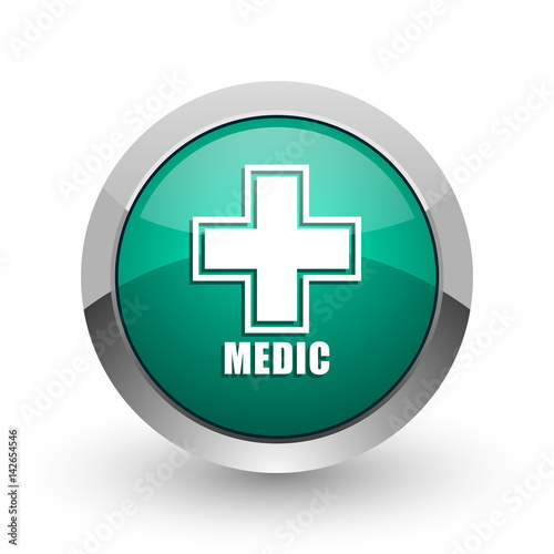© Alex White, Obraz premium Medic silver metallic chrome web design green round internet icon with shadow on white background.