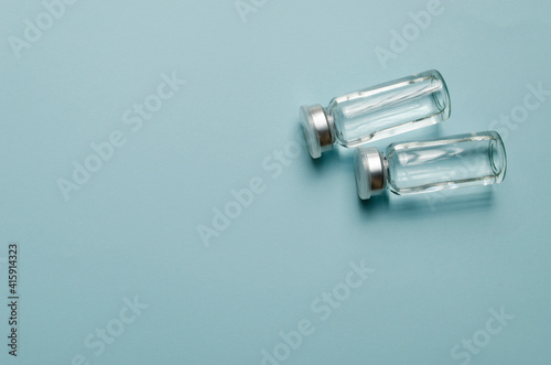 © Olga, Naklejka premium Medical concept.Medical jars with covid vaccine on blue background. Immunization and treatment for coronavirus infection. Place for text.Blur