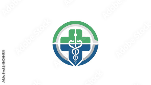 © Agis, Obraz premium Medical cross symbol with caduceus staff inside a circular frame logo.