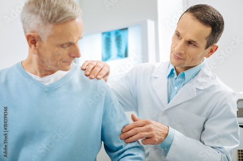 © zinkevych, Obraz premium Medical diagnostics. Professional nice mart doctor standing near his patient and checking his arm while working with him