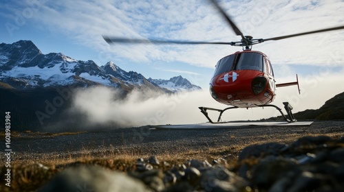 © aulaiphon, Obraz premium medical helicopter softly landing on mountain helipad, snow-capped peaks in view