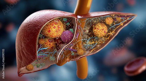 Fototapeta premium Medical illustration showing the process of liver fibrosis resulting from chronic fatty liver disease inflammation