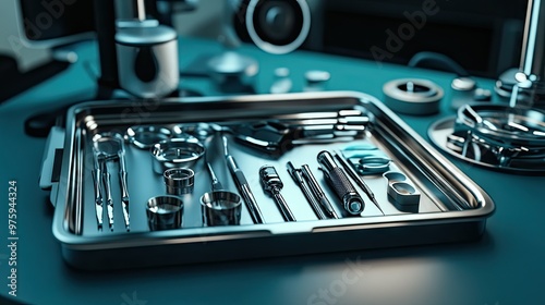 Fototapeta premium Medical instruments laid out on a tray, ready for a cataract surgery procedure in a sterile environment.